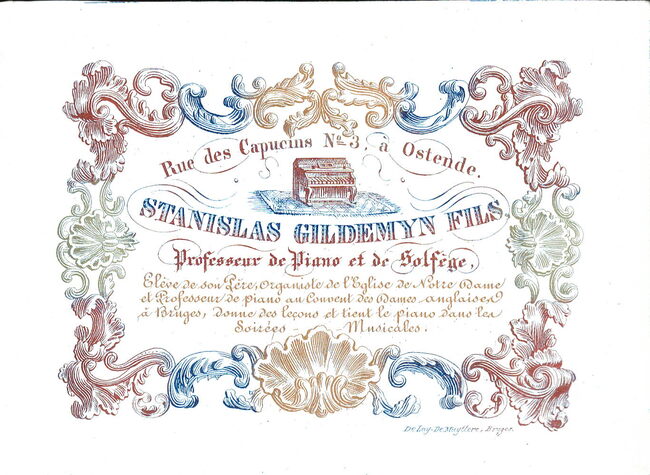 Formaat : 8,5 x 11,7 cm. - Rue des Capucins nr 3 à Ostende. Stanislas Gildemyn fils. Professeur de piano et de solfège. Elève de son père organiste de l'eglise de Notre Dame et professeur de piano au couvent…