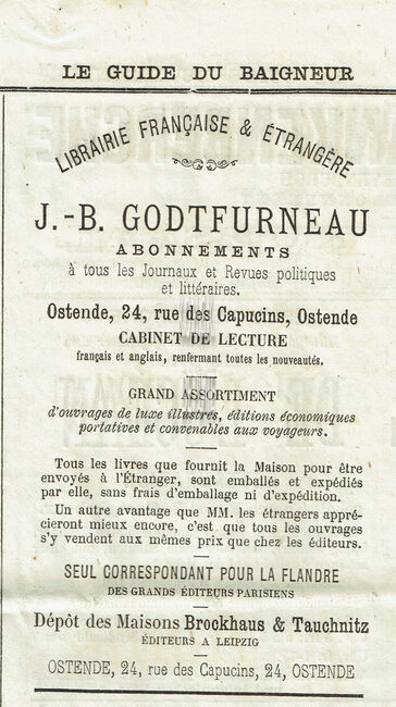 Advertentie : Librairie Française et Etrangère J.-B. Godtfurneau. 24, rue des Capucins, Ostende