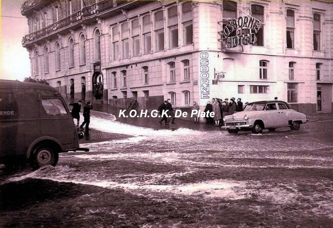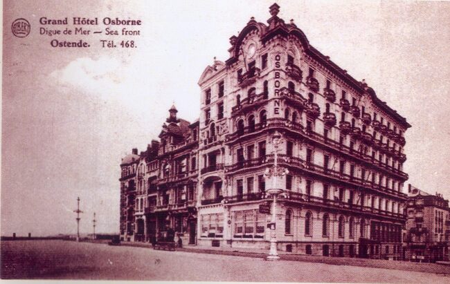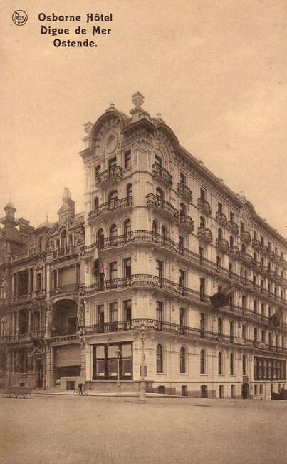 Het befaamde "Grand Hôtel Osborne", waarvan de balkons met zwanen versierd waren. Gelegen op de hoek van de Zeedijk en de Kapucijnenstraat. (Omer Vilain)