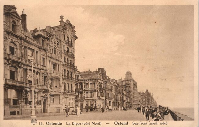 Albert, N° 16. - Ostende - La Digue (côté Nord). Ostend - Sea-front (north side). - De Zeedijk met de grote hotels, o.a. "Hotel de Bruxelles (nr.30) en op de hoek met de Kapucijnenstraat, het "Grand Hotel Osborne"