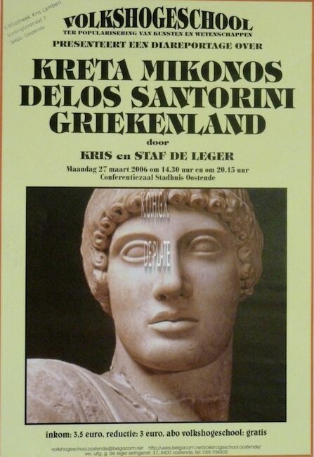 Affiche : Volkshogeschool. Kreta, Mikonos, Delos en Santorini : Griekenland. Conferentiezaal stadhuis Oostende. 27/03/2005