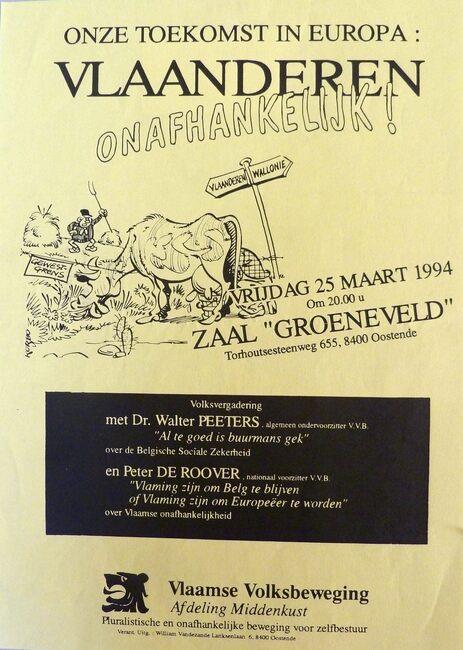 Affiche : Vlaamse Volksbeweging Afdeling Middenkust. Volksvergadering. Onze toekomst in Europa : Vlaanderen onafhankelijk!. Zaal Groeneveld. 25 maart 1994