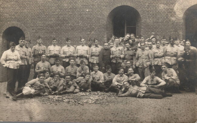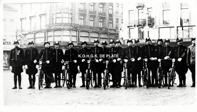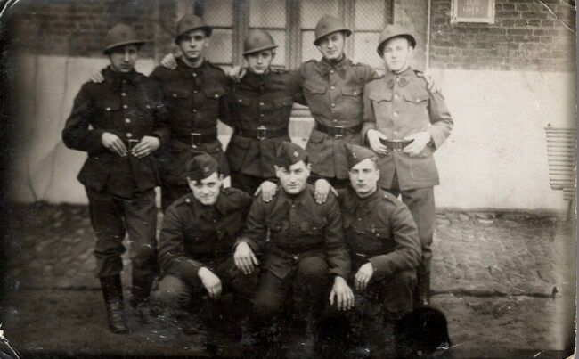 Formaat : 13 x 17,5 cm. - Zittend v.l.n.r. : Albert Bens, Guillaume Soenen en Michel Surmont. Staand v.l.n.r. : Fritz Albyne, Amandus De Groot, Fernand Mouqué, Frederik Seynaeve, Carlo Bens en Theo De Busschere