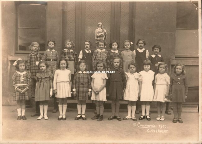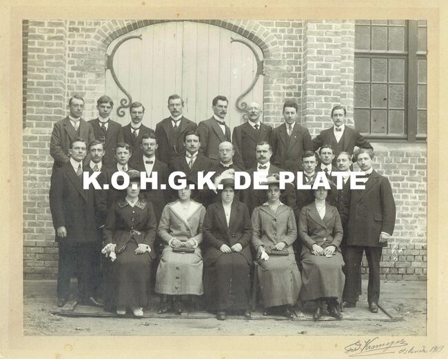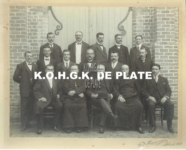 Formaat : 22 x 28 cm. - v.l.n.r. eerste rij : M.A. Lescrauwaet (voorzitter) ; Z.E.H. Camerlynck (deken van Oostende en erevoorzitter) ; Jules Van der Heyde (volksvertegenwoordiger en senator) E.H. Louis Colens ; Henri…