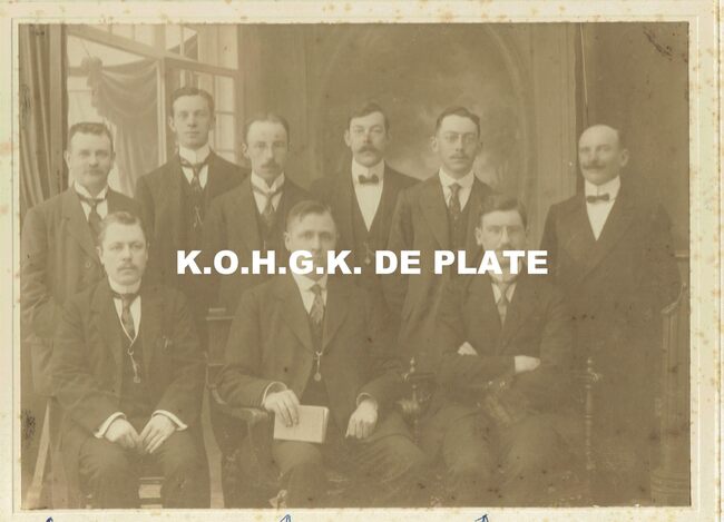 Groepsfoto van de Toneelmaatschappij “ Door Strijd tot Zege!” met vaandel op de binnenkoer van het "Grand Hotel Fontaine" Oostende 17 maart 1914 AFMETINGEN INTERN : 37,5 x 47,5 cm AFMETINGEN…