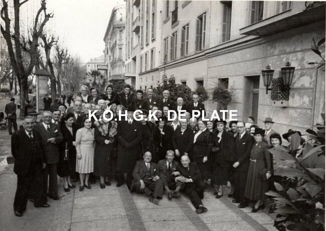 Formaat : 39 x 49 cm. - 24 leden van de toneelvereniging "Hoop in de Toekomst", poserend met vaandel op de binnenkoer het "Grand Hotel Fontaine".