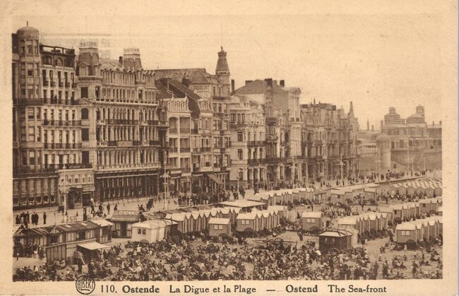 Nels Bromurite. Ostende - Les grands hôtels sur la digue. Oostende - De groote hotels op de Zeedijk. Ostend - The large hotels on the front. - Strandrecreatie op het Groot Strand. Achteraan, de badinstallaties onder de…