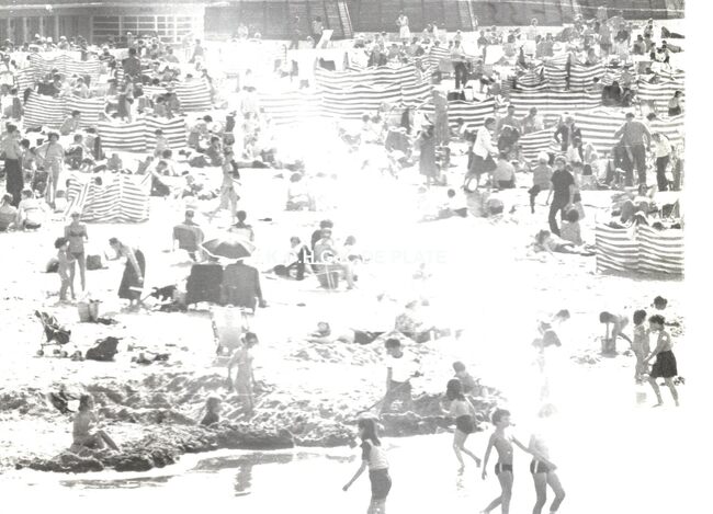 Formaat : 28 x 40 cm. - Zicht op het vierde kursaal en de zeedijk vanaf het Groot Strand. In de voorgrond enkele toeristen die pootje baden