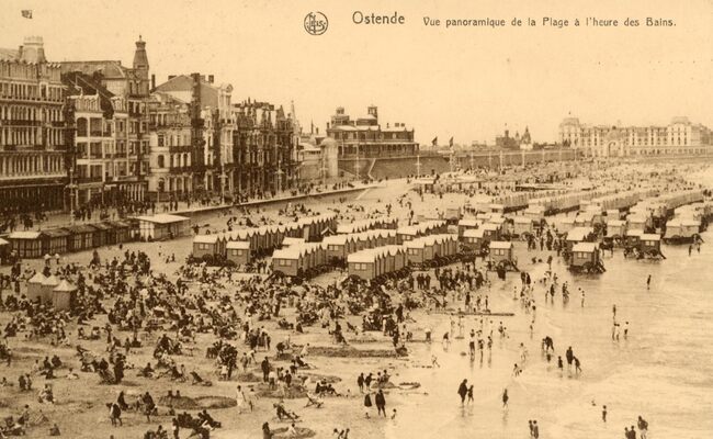 Ostende, vue sur la plage. - Oostende in de Belle Epoque. Strandrecreatie op het Groot Strand. Links, een rij luxe badkarren. Op de achtergrond, de westgevel van het derde Kursaal langs de Zeedijk