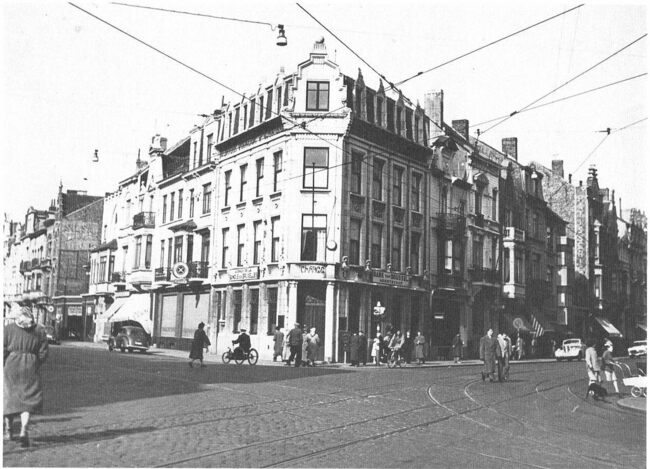 Hoek Wittenonnen- en Kapellestraat na de overstroming van 01/02/1953. Rechts, Savelkoul. De ingang van de appartementen was in de Wittenonnenstraat onder die gebogen luifel. Links de Kredietbank