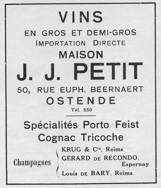 Vins en gros et demi-gros. Importation directe. Spécialités Port Feist. Cognac Tricoche. Champagnes : Krug & Cie (Reims), Gerard de Recondo (Espernay), Louis de Bary (Reims)