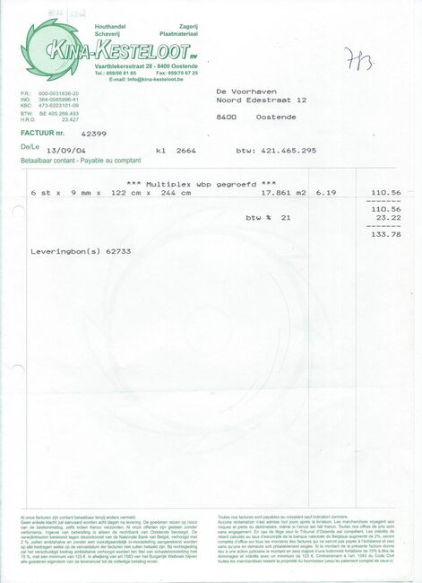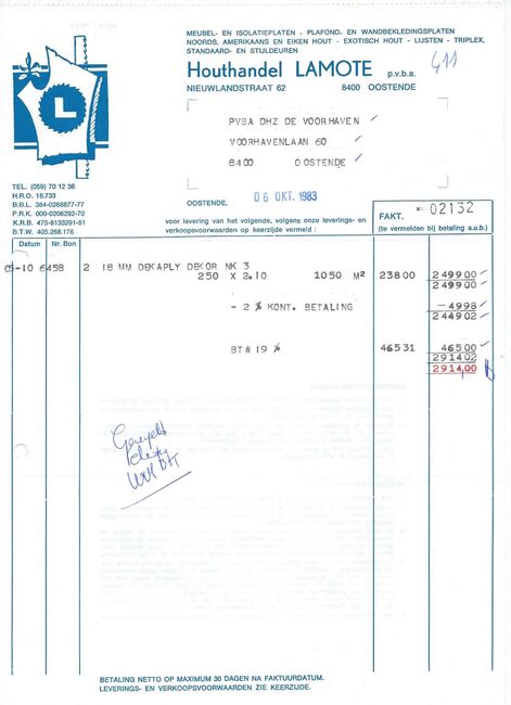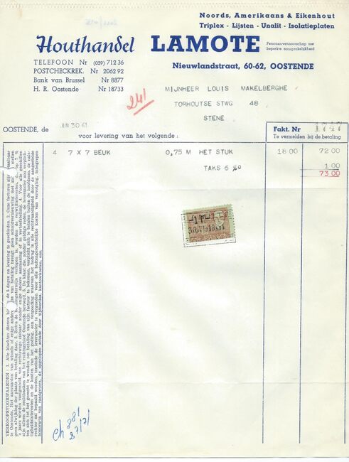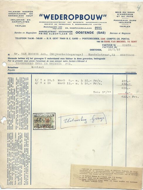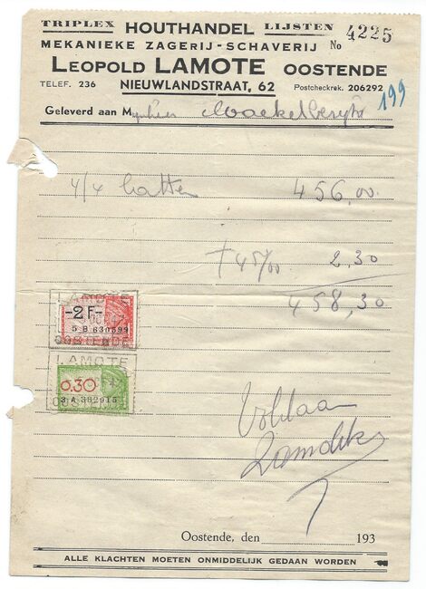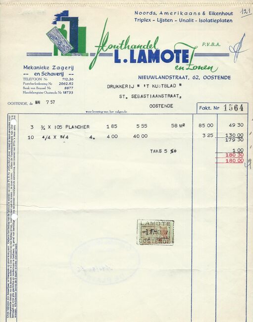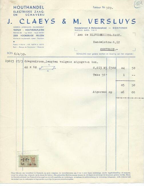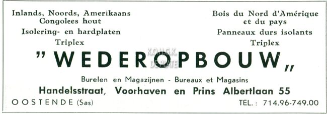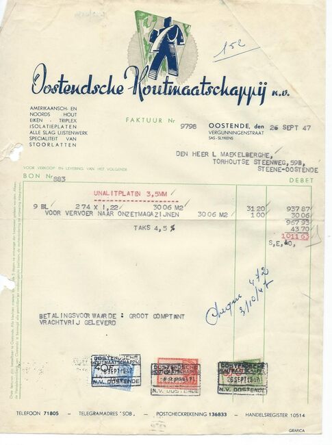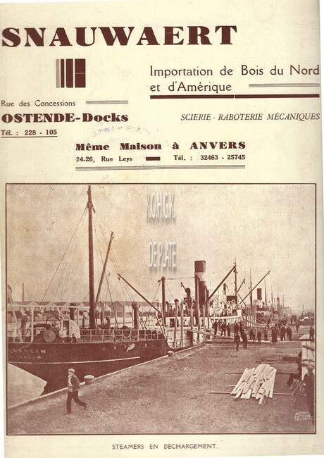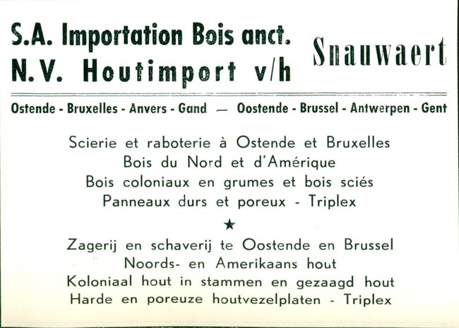 Oostende, Brussel, Antwerpen, Gent. Zagerij en schaverij te Oostende en Brussel. Noords- en Amerikaans hout. Koloniaal hout in stammen en gezaagd hout. Harde en poreuze houtvezelplaten. Triplex.