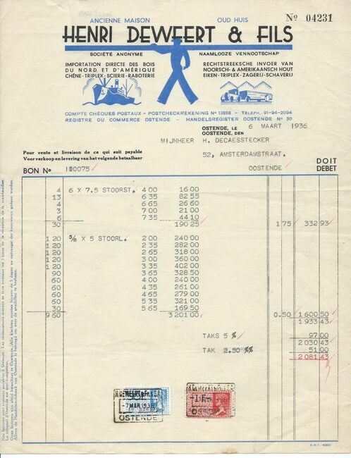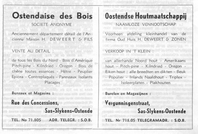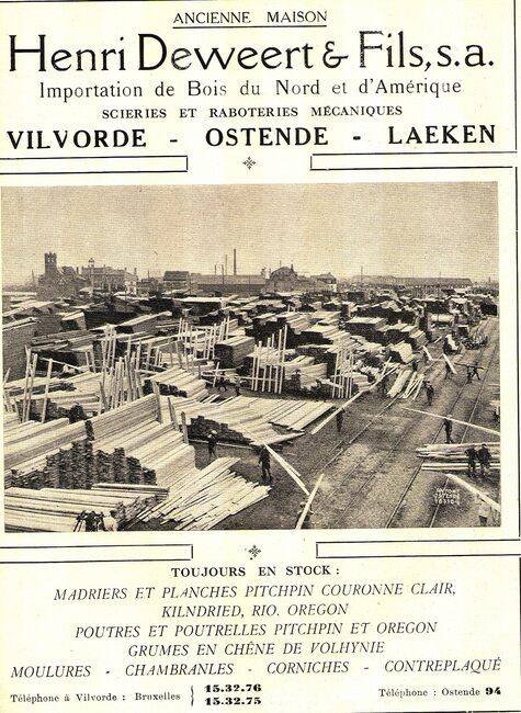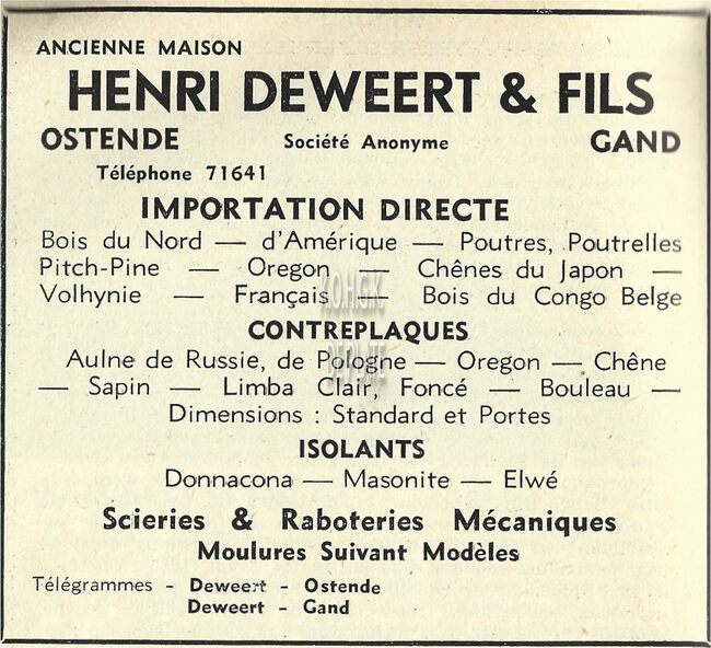 Oud Huis Henri Deweert & Fils, nv. Houtimport. Ontstaan door overname van een houthandelsbedrijf dat door Henri Deweert werd opgericht. De firma importeert Noords-, Amerikaans- en Braziliaans hout, bedoeld voor de…