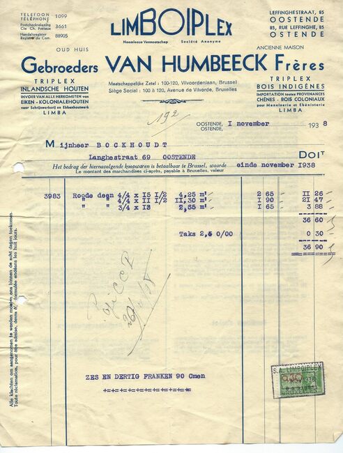 Oud huis Gebroeders Van Humbeeck. Maatschappelijke zetel : Vilvoordelaan 100-120, Brussel. - Triplex - Inlandse houtsoorten - Invoer van all herkomsten van eiken - kolonialehouten voor schrijnwerkerij en ebbenhoutwerk.…