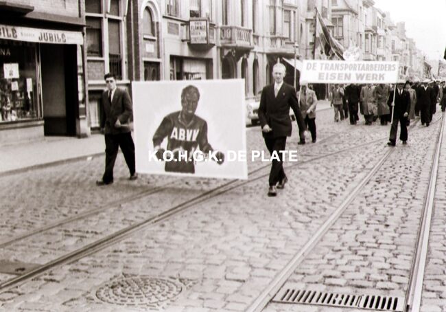Negatief. - De transportarbeiders in de 1 meistoet op de Nieuwpoortsesteenweg ter hoogte van de Heilig Hartlaan. Links krantenwinkel "Femina" en café " Flamingo". De rails van de stadstram liggen…