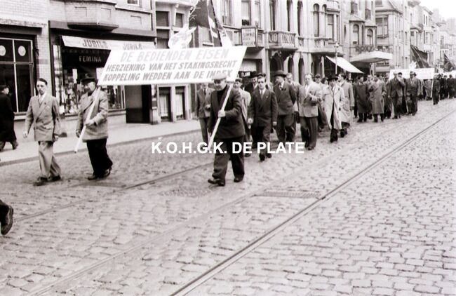 Negatief. - De bedienden stappen mee op in de 1 meistoet. Links krantenwinkel "Femina" en café "Flamingo". . Er wordt een bord gedragen met de tekst : "De bedienden eisen herziening van het…