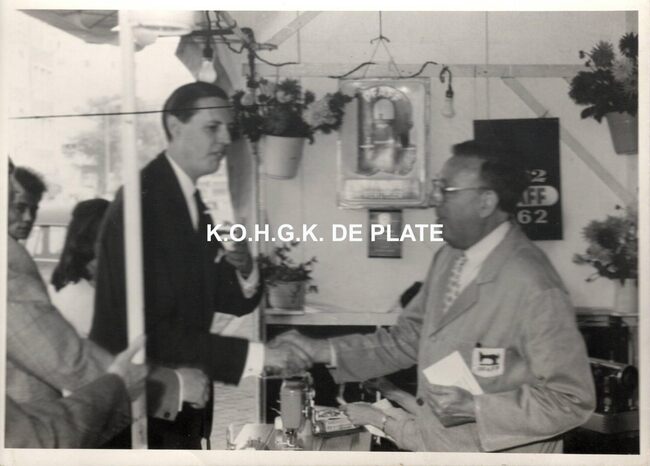 Formaat : 13 x 18 cm. - Burgemeester Jan Piers feliciteert de zaakvoerder tijdens de braderie ter gelegenheid van het honderd jarig bestaan van de winkel op de Alfons Pieterslaan