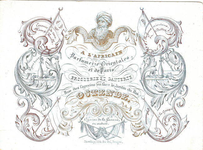 Afmeting : 12 x 16 cm. - A L'Africain, Parfumerie Orientales et de Paris. Brosserie et Ganterie, Rue des Capucins en face le jardin du Roi Ostende. Cigares de la Havane et autres. Essence de roses, Musce & …