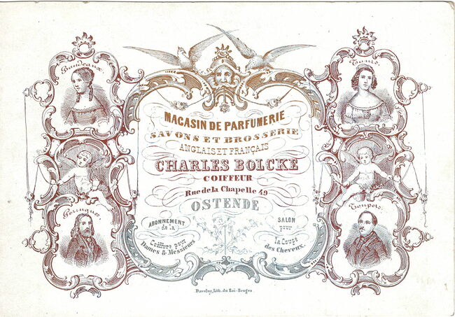 Afmeting : 10,2 x 15 cm. - Magasin de Parfumerie Savons et Brosserie Anglais et Français Charles Bolcke. Coiffeur Rue de la Chapelle N° 49 Ostende. Bandeaux perruques Tours Toupets. Abonnement de la coiffure pour Dames…