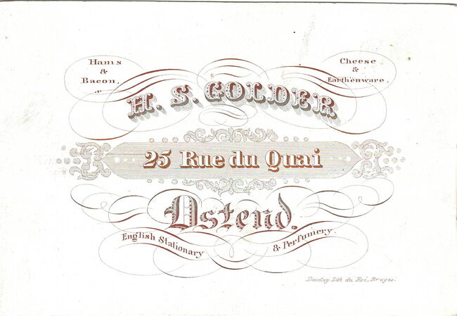 Formaat : 8,8 x 13 m. - Hams & Bacon, Cheese & Earthenware. English stationary & Perfumery. H.S.Golden - 25 Rue du Quai - Ostend.