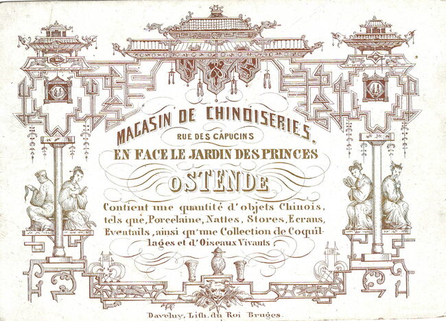 Formaat : 9 x 12,5 mm. - Magasin de Chinoiseries - Rue des Capucins en face le jardin des Princes Ostende. Contient une quantité d'objects Chinois tel que Porcelaine, Nattes, Stores, Ecrans, Eventails ainsi qu'…