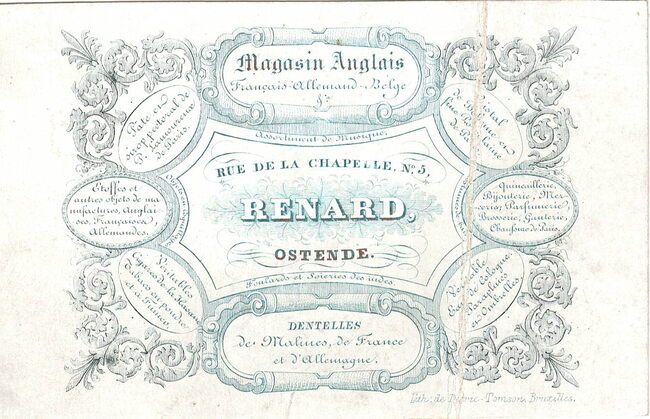 Formaat : 7,3 x 11,5 cm. - Magasin Anglais Français Allemand Belge Renard Assortiment de musique, Foulards et Soieries des Indes. Dentelles de Malines de France et d'Allemagne. Pâté et cirop pectoral de P. Lamoureux…