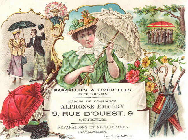 Formaat : 11 x 14,5 cm. - Parapluies & ombrelles en tous genre. Maison de confiance Alphonse Emmery. 9, Rue d'Ouest, Ostende. Réparations et recouvrages instantanés.