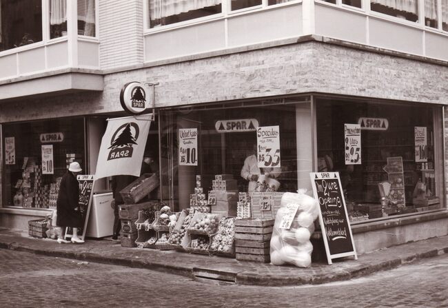 Formaat : 13 x 18 cm. - Groentenwinkel Spar op de hoek van de Kapucijnenstraat en Verlorenstraat.