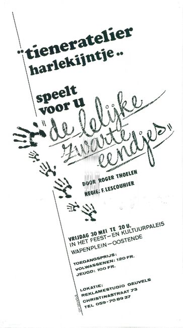 Affiche : Tieneratelier Harlekijntje. "De lelijke zwarte eendjes". Feest- en Kultuurpaleis. 30 mei ....(?)