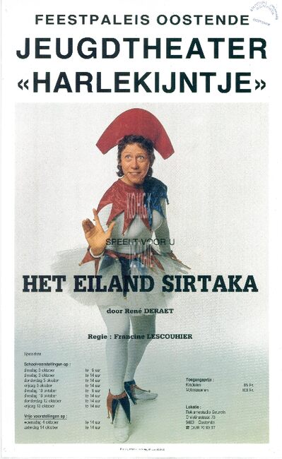 Affiche : Jeugdtheater "Harlekijntje". Het eiland sirtaka. Feest- en Kultuurpaleis Oostende. oktober/....(?)