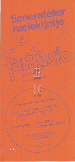 Affiche : jeugdtheater Harlekijntje. Fantasio. Feestpaleis Oostende. 5,7,8,9,11,12,13,14,15 oktober ....(?)