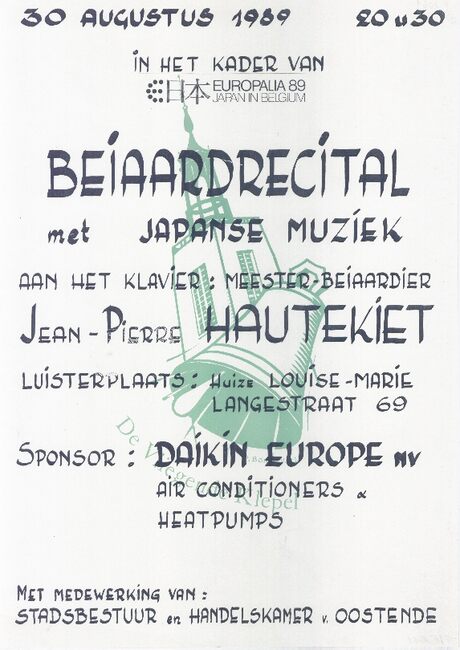 Affiche : Jean-Pierre Hautekiet. Beiaardrecital met Japanse muziek. Luisterplaats Huize Louise-Marie. 30 augustus 1989