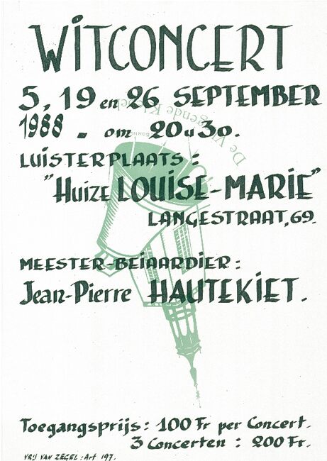 Affiche : Meester-beiaardier : Jean-Pierre Hautekiet. Witconcert. Luisterplaats "Huize Louise-Marie". 5, 19 en 26 september 1988