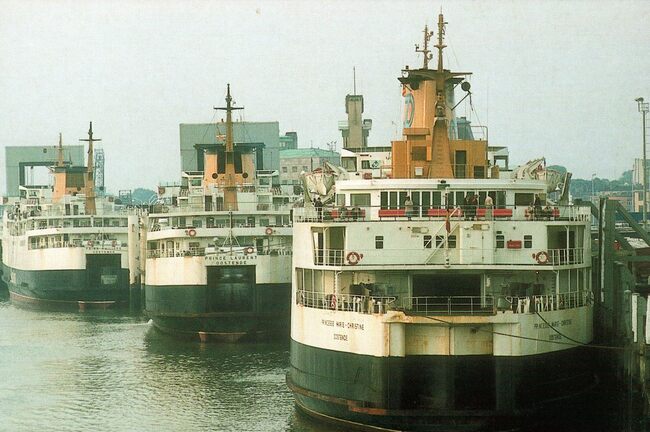 Formaat : 13 x 18 cm. - Aangemeerde ferry's aan de Sir Winston Churchillkaai bij de twee laadbruggen. Zicht op de stad