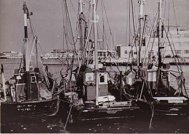Foto 18 x 13 (ex invent 0088/93cc). Vissersvaartuigen in het Montgomerydok. Rechts het gebouw van het Loodswezen aan de Sir Winston Churchillkaai 2