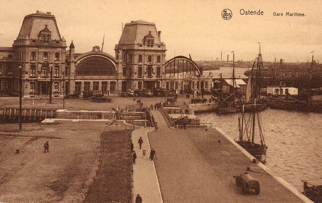 Nels/Thill. - Ostende - Gare maritime. Het Zeestation. We zien nog de vernielingen aan de perrons tijdens de Eerste Wereldoorlog. Rechts, vissersvaartuigen in het eerste handelsdok. De brug over de zeesluis (links…