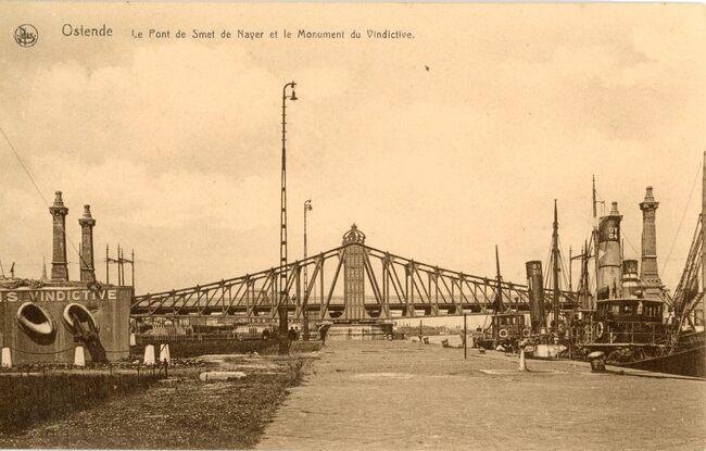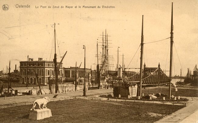 Nels/Thill 13, 119. - Ostende - Le Pont De Smet de Naeyer et le Monument du Vindictive. De naam van de brug is verkeerd op de kaart. Dit is de Demeybrug over de zeesluis Demey. Links het Vindictive memoriaal