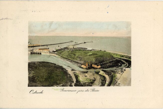 Walschaerts 14874. - Bijgekleurde kaart. - Ostende - Panorama pris du Phare. - Opname vanaf de vuurtoren op de Oosteroever. Vooraan, het militair domein De Halve Maan"en links de Leopoldsluis.