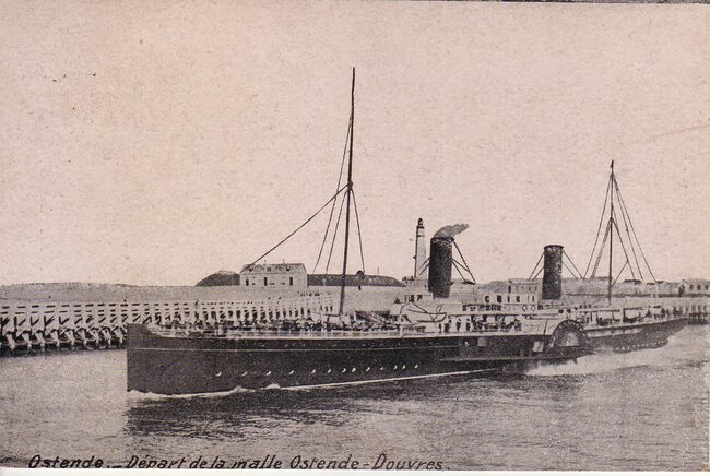 Edit. V.G. [=Victor Grégoire], avenue du Pidi, Bruxelles. - Ostende - Départ de la malle Ostende-Douvres. - De raderstoomboot "Marie-Henriette" in de havengeul van Oostende. We zien het ooststaketsel en de…