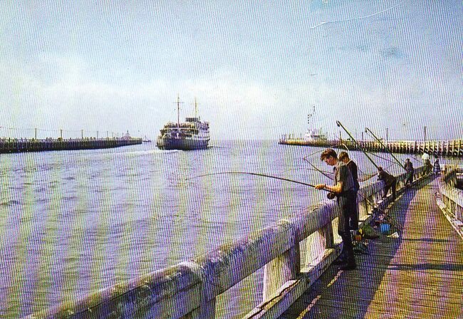 Nels, série 13, N° 80. - Ostende - L'Estacade et la rentrée de la Malle. - De pakketboot "Princesse Elisabeth" vaart de haven Oostende uit. - Enkele jongeren zijn aan het hengelen op het Weststaketsel.…