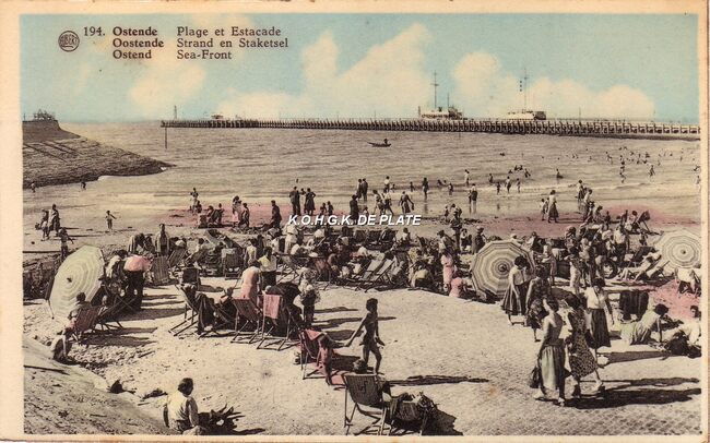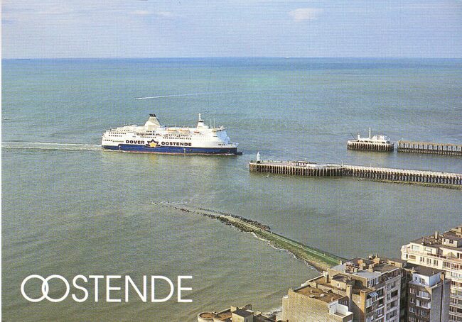 JC. - De Albert I-promenade en links, het Groot Strand bij vloed. Een pakketboot van de Oostende Dover lijn nadert de havengeul