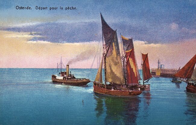 Ostende - Départ pour la pêche. - Gekleurde kaart. - Zeilvissersvaartuigen worden de haven uitgesleept door een sleepboot.