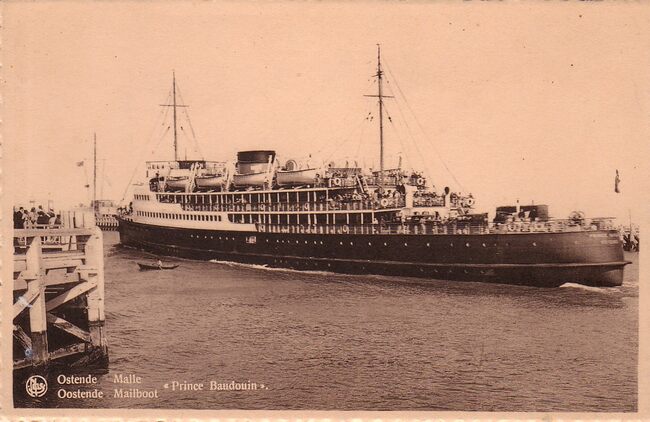 De pakketboot "Roi Léopold III" vaart de haven van Oostende binnen. Op de achtergrond, de "Halve Maan" op de oosteroever.