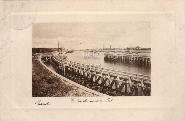 Walschaerts. - Ostende - Entrée du nouveau Port. - De haven richting de zee vóór de havenwerken van 1905. Links, aan de kaai gemeerd, pakketboten van de Oostende Doverlijn. Rechts, in de havengeul ligt het jacht van…