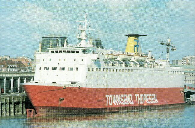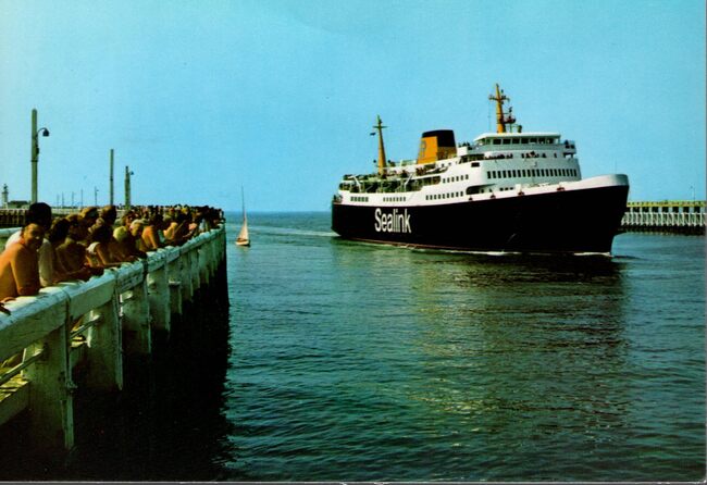 Formaat : 10 x 16,5 cm. - Rechts de carferry "Koningin Fabiola" aan de laadbrug.