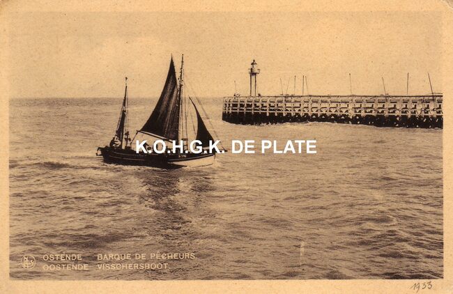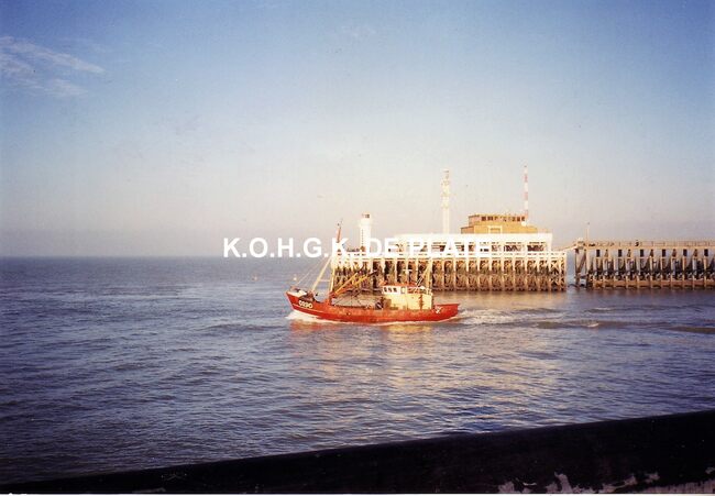 Formaat : 10.5 x 15 cm. - Vissersvaartuig O.190 "Renilde" in de havengeul. Op de achtergrond, de tijseinpost op het Ooststaketsel