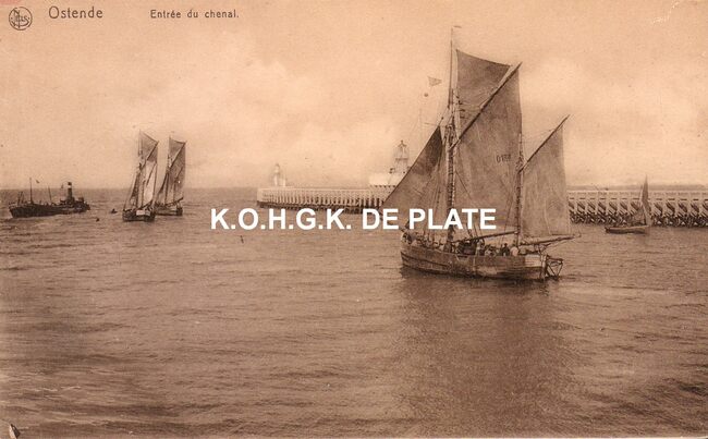 Nels. - Ostende - Entrée du chenal. - Drie Oostendse tweemastsloepen verlaten de havengeul van Oostende. Op de achtergrond, het Ooststaketsel