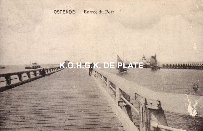Ostende - Entrée du port - Het Weststaketsel. Enkele zeilvisserssloepen in de havengeul. Rechts, gedeelte van het Ooststaketsel