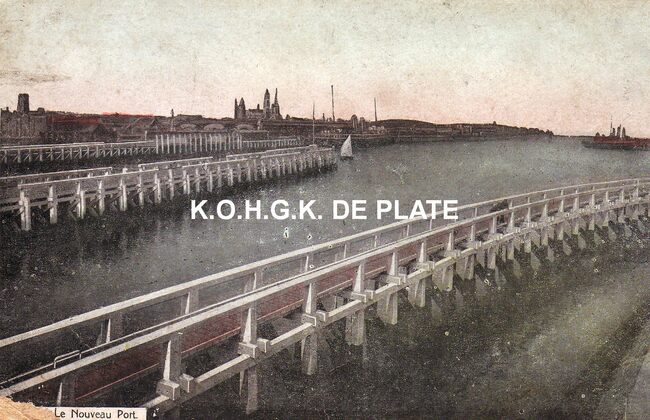 Edit. V.G. [= Victor Grégoire], 42, Avenue du Midi, Bruxelles. - Ostende - Le nouveau port. - Bijgekleurde prentkaart. - De havengeul met zicht op het eerste Zeestation en het centrum van de stad, met de Sint Petrus en…