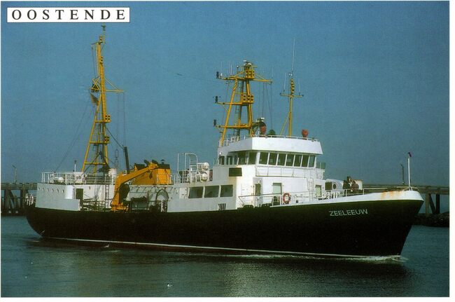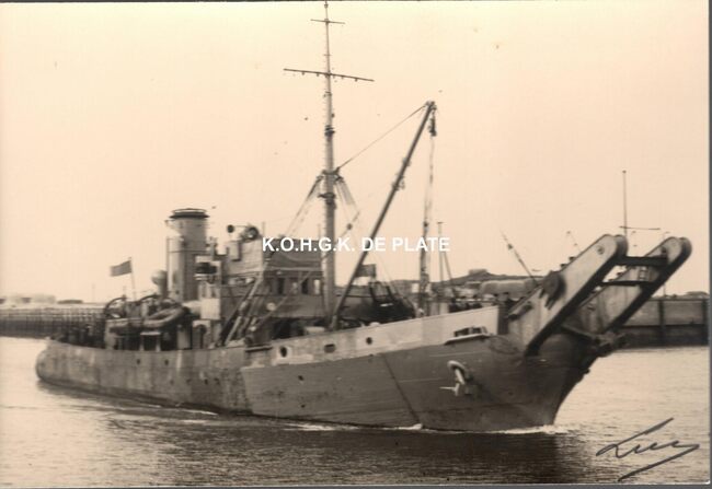 Formaat : 11 x 16,5 cm. - Het schip bij aankomst in Oostende in 1947. Het schip werd uitgeleend aan de Belgische Marine van 1946-1949. Gebouwd in 1939 bij Blyth Shipbuilding & Dry Docks Co Ltd, Blyth Engeland.…